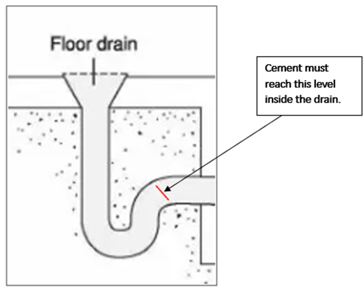 - The floor drain must be completely filled with cement including the trap in the drain.